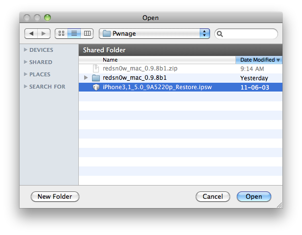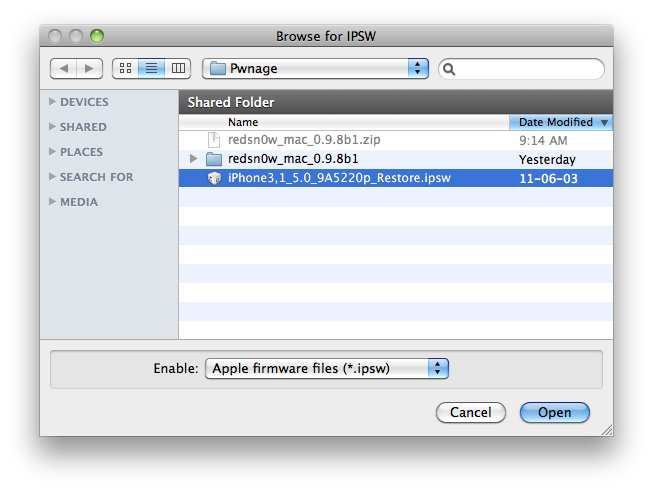 Select the 5.0b1 firmware ipsw we placed in the Pwnage folder on our desktop then click Open.