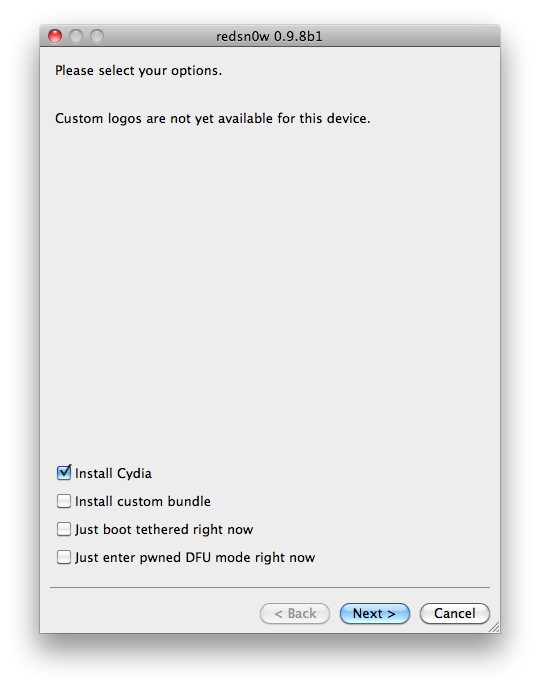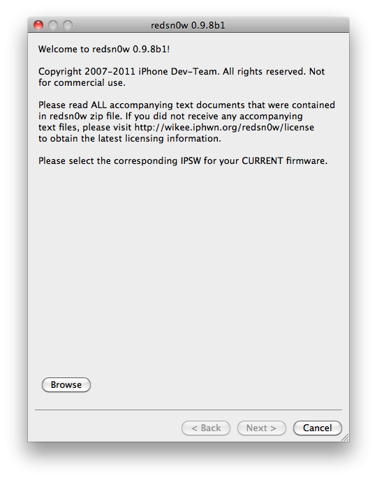 Once iTunes has finished updating your iPhone to the desired firmware open the Pwnage folder on your desktop and launch the redsn0w application from the redsn0w folder we extracted earlier.