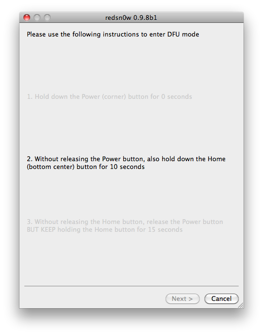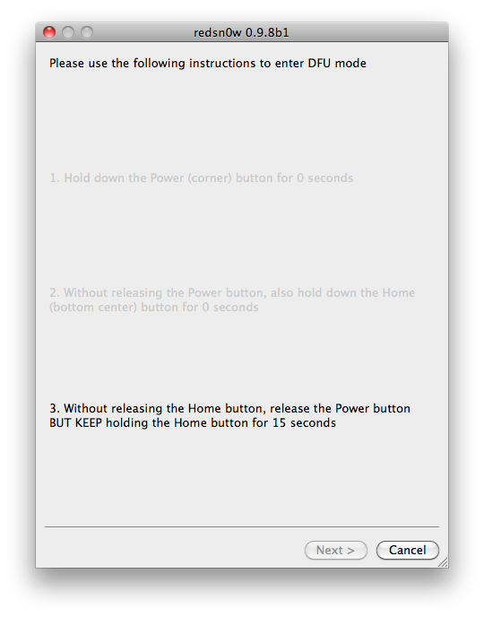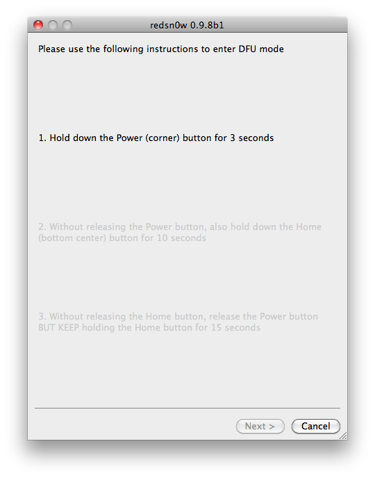 RedSn0w will now guide you through the steps to get into DFU mode. You can find more help with DFU mode here