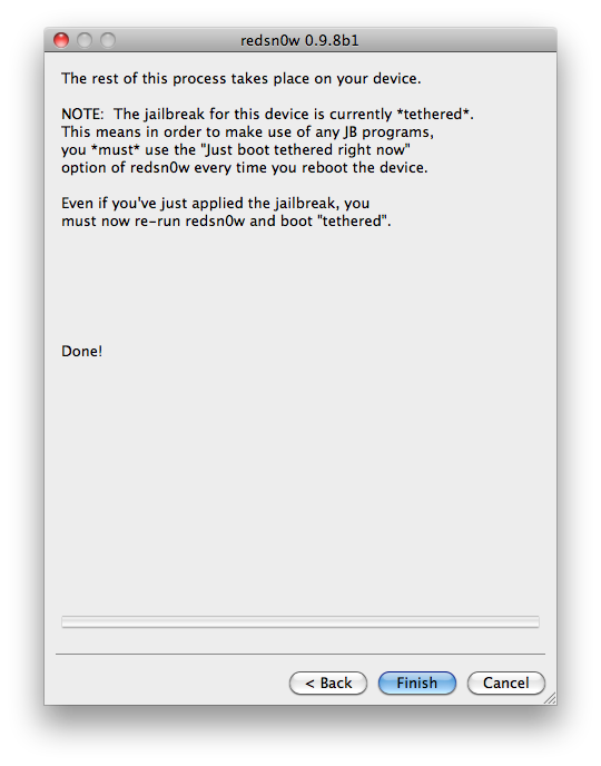 Once this is complete you will be notified that RedSn0w is done. Click the Finish button. When your iPhone finishes rebooting (5 minutes or so) it will be jailbroken with Cydia on the SpringBoard.